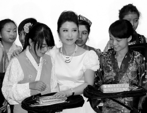 | 刘媛媛(中)给玉树、舟曲学生送礼品 |