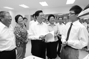 9月9日,在第26个教师节即将到来之际,胡锦涛总书记来到中国人民大学及附属中学,看望慰问师生员工,向广大教师致以节日祝贺。 这是胡锦涛在人大附中设计技术教室亲切勉励学生们勤动手、勤动脑,努力掌握更多真才实学。 新华社发