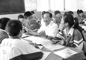 9月10日,中共中央政治局常委、国务院总理温家宝来到河北省兴隆县六道河中学,看望广大师生,并与中小学教师和北京师范大学免费师范生代表座谈。他向广大教师和教育工作者致以节日的祝贺。 这是温家宝与九年级2班同学一起上语文课外阅读课。 新华社发