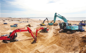 9月10日,海南洋浦神头港区已变成偌大的工地,A区填海工程将在11月30日交地。据介绍,正在进行的1348亩填海造地工程,是为我省引进的200万吨/年PTA大型石化重点项目提供建设用地。为赶工期,省洋浦开发建设控股有限公司投入5000多人力,大型工程机械车辆500多台昼夜24小时施工。 本报记者 苏晓杰 摄