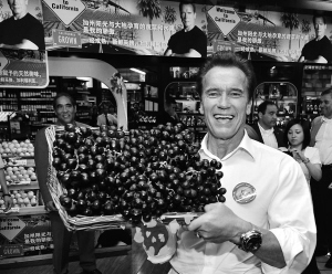 9月11日,美国加利福尼亚州州长、著名影星施瓦辛格来到杭州一家商场举行的加州美食节活动现场,向市民推销加州农产品。 施瓦辛格此行是来参加在杭州举行的2010年网商大会。 新华社发
