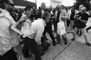 9月11日,在希腊北部城市塞萨洛尼基,一名向希腊总理帕潘德里欧掷鞋的男子(下)被安全人员制服。 当天,希腊总理帕潘德里欧参观塞萨洛尼基国际博览会时遭一男子掷鞋袭击,但没有被鞋击中。 新华社发(马里奥斯·罗洛斯摄)