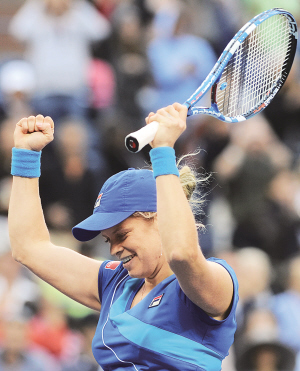9月10日,在美网公开赛女子单打半决赛中,卫冕冠军、比利时选手克里斯特尔斯以2:1战胜美国选手大威廉姆斯,晋级决赛。克里斯特尔斯在决赛中的对手是俄罗斯选手兹沃娜列娃。图为克里斯特尔斯庆祝获胜。 新华社记发