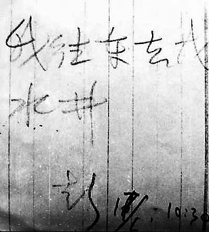 12点30分,原在63号大卡车下休息的司机王万轩,去越野车拿衣服。他在越野车的驾驶室里,发现彭加木的那本地图册中夹着一张纸条,纸条有一半露出外边,上面用铅笔写着: