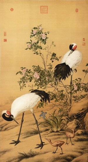 从现存的郎世宁墨迹来看,它既有西洋油画如实反映现实的艺术风格,又有中国传统绘画中凸显的笔墨趣味,两者合一,呈现出了异于常人的艺术感染力。在1724年所绘的为雍正祝寿的《禽献英芝图》中,郎世宁充分展示了他的西洋油画功底。这幅画造型准确、精细,以素描和明暗效果使图中物体具有了比较强烈的凹凸感和立体感。弯曲盘旋的松树枝叶掩映,树皮斑驳,居中挺立的白鹰则极为突出,羽毛的质感很强,呼之欲出。中国画很重要的一点是,它并不仅将山水动植物当作客观存在之物,而是要赋予这些事物某种哲学上的喻意。图中所出现的苍松、雄鹰、灵芝、山石、流水,在中国传统文化中多表达强健、长寿和吉祥的寓意。而在色彩上,郎世宁则展现了不同于中国传统的鲜艳。鹰白、松绿、芝棕红、土坡绛色和藤萝花粉紫,给人鲜明、绚丽和浓重的感觉。这即是郎世宁卓然于其他宫廷画师的原因。他以严谨扎实的写实功底、注重明暗效果的绘画特色,以及作品整体上浓厚的欧洲绘画风格和情调,同时又融合了传统中国画的飘逸写意,从而确立了自己在官廷画师中的优势地位。