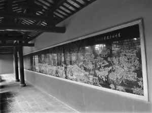 | 崖州学宫内的《崖城古城景观图》黑石板线刻画。