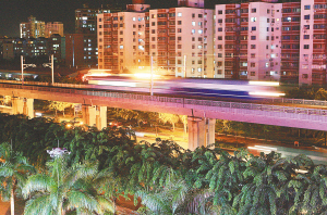 | 9月12日晚9时55分,由内燃机车头拖挂的冷滑车厢在东环海口特大桥上进行运行试验。 本报记者 古月 摄 |