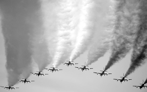 9月12日,意大利“三色箭头”特技飞行队在意大利里沃尔托军事基地上空表演特技飞行。 新华社/法新 9月12日,西班牙空军特技飞行队在意大利里沃尔托军事基地上空表演特技飞行。 新华社/法新