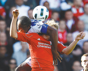 13日,在英超联赛中,利物浦队客场以0:0战平伯明翰队。图为双方球员在比赛中争抢。 新华社发