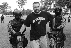 9月12日,在墨西哥普埃布拉市郊,墨西哥海军陆战队士兵押送被捕的毒枭塞尔希奥·比利亚雷亚尔·巴拉甘。