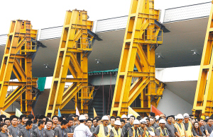9月13日,上海振华重工为美国加利福尼亚州新海湾大桥建造的第五船钢箱梁从上海启运。该大桥是世界第一大单塔自锚式抗震悬索钢结构桥梁。参与美国新海湾大桥建设是我国大型国有企业进军世界大型钢结构市场的重要标志。 新华社发