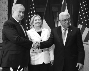 9月14日,以色列总理内塔尼亚胡(左)、美国国务卿希拉里(中)和巴勒斯坦民族权力机构主席阿巴斯在埃及海滨城市沙姆沙伊赫会面。 巴勒斯坦和以色列领导人当地时间14日中午在埃及旅游胜地沙姆沙伊赫开始9月初以来的第二轮直接会谈。 新华社/法新