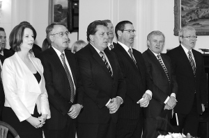 | 吉拉德带领新内阁成员唱国歌。 新华社发 |