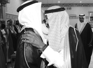 沙特婚礼别具特色,新郎新娘同时在不同地点举办婚礼。在新郎的婚礼上,看不到任何异性,没有音乐、没有鞭炮、没有结婚仪式。而出席者都为女性的新娘婚礼上,来宾们身着华丽礼服,在欢快和热烈的阿拉伯音乐伴奏下,跳舞直到深夜。 图为在一个结婚礼堂前,新郎(左)与来宾亲吻脸颊。 新华社发