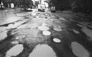 9月12日下午,雨中的海口市秀英区向荣路千疮百孔,汽车行人在这些陷阱般的大坑小坑间艰难前行。