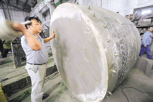 9月15日,工作人员敲击金鼓测试鼓音。 一面以农耕文化为主题的中华盛世金鼓即将在南京面世。此鼓由通过特殊工艺处理的青铜铸造而成,造型沿用我国古代金鼓外形,仿商周纹饰,鼓身直径2.01米,长度2.39米,重达6.3吨。中华盛世金鼓是宁夏回族自治区为举办中华黄河文化圣坛而造。 新华社记者 韩瑜庆 摄