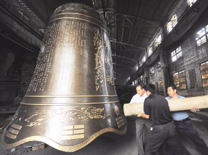 9月15日,工作人员敲击大钟测试大钟的音质。 由金陵古艺术青铜研究所设计的“黄河第一大钟”,近日在南钢集团江苏机械制造有限公司浇铸成功。此大钟是宁夏回族自治区为举办中华黄河文化圣坛制造的一件重要法器。大钟选九州之青铜,体重9.999吨、全高3.6米、肩高3.06米、口径2.61米,蒲牢高0.54米。饰以“太极”“八卦”“河图”“洛书”“青龙”“白虎”“朱雀”“玄武”与贺兰山“人物和农庄”岩画等黄河文化吉祥图案,被誉为“黄河第一大钟”。 新华社记者 韩瑜庆 摄