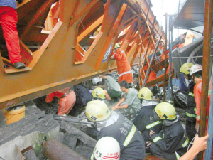 被埋11人均已获救 9月15日,在浙江台州椒江二桥塔吊倒塌事故现场,救援人员紧急救援被埋工人。 当日下午2时左右,浙江台州在建的椒江二桥工地一塔吊下坠,导致一工棚垮塌,现场11人被埋受伤,目前均已经成功获救。 新华社发(王天荣 摄)