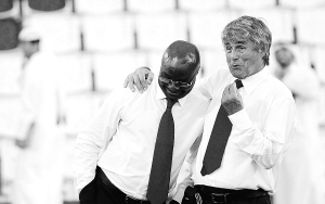 9月14日,国际足联世界杯考察团访问卡塔尔首都多哈,对2022年世界杯申办国卡塔尔进行基础设施、公共交通、宾馆等项目进行为期3天的考察。 图为米卢(右)和前喀麦隆国脚米拉在考察中轻松谈笑。 新华社发