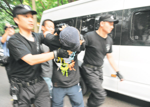 | 9月16日,在重庆江北区宏进药店新力药房附近,犯罪嫌疑人被警方带走。