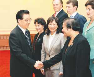 这是开幕式前,国家主席胡锦涛会见出席会议的APEC各成员代表团团长。新华社发