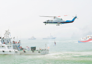 这是来自大陆的专业救助直升机进行立体搜救现场。9月16日,“2010年海峡两岸海上联合搜救演练”在台湾海峡厦门、金门附近海域举行,两岸10余艘船只和3架直升机参与。此次联合演练主题为“保障两岸三通 共建平安海峡”,是两岸搜救力量首次共同策划、组织、参与、合作和完成大规模的海上联合演练。 新华社发