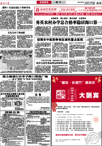 海南日报 本省新闻综 合 005 2010-09-171 2010年09月17日 星期五