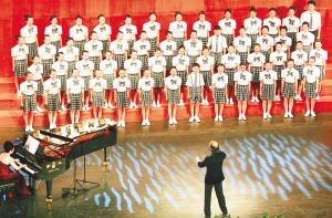 在今天的合唱会现场,记者看到以红色为主色调的剧场内饰高贵典雅,整个舞台上方各有5道的顶光、逆光,正前方设置2道面光,左右两边各有5个可以上下左右移动的灯光吊笼,演出时各种灯光相互配合,达到最佳舞台效果。