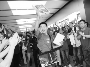 9月17日,在北京三里屯Village的苹果专卖店,第一个购买到苹果iPad的韩子文兴奋不已。 当日8时,苹果iPad在内地正式发售。 新华社记者 罗晓光 摄