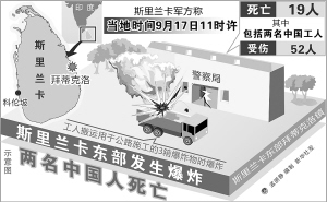 据新华社科伦坡9月17日电 (记者刘咏秋)斯里兰卡军方17日说,斯东部拜蒂克洛镇一警察局附近当天发生爆炸,造成包括两名中国工人在内的19人死亡,52人受伤。