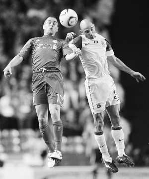 9月17日,在欧罗巴联赛K组首轮比赛中,利物浦队主场以4:1战胜布加勒斯特星队。图为利物浦队球员乔·科尔(左)与布加勒斯特星队球员安格洛夫争顶。 新华社发