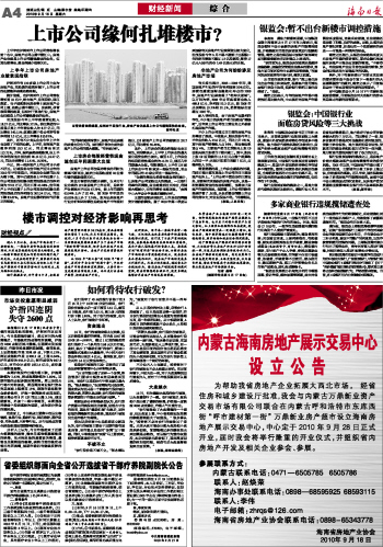 海南日报 财经新闻综 合 004 2010-09-181 2010年09月18日 星期六