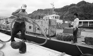 | 9月18日,宜兰渔民用缆绳将渔船固定在渔港,以应对超强台风“凡亚比”。 新华社发 |