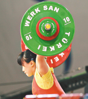 18日,在土耳其举行的举重世锦赛女子53公斤级比赛中,陈晓婷以抓举100公斤、挺举122公斤、总成绩222公斤包揽该项目3块金牌。 新华社发
