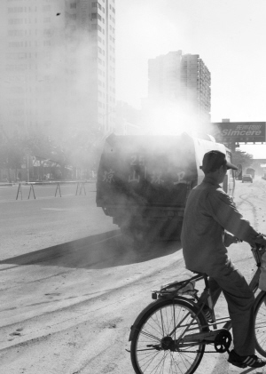 | → 9月19日,一辆环卫车正在作业,扬起灰尘一片。 本报记者记者 古月 摄 |