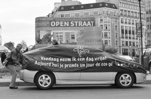 “今天我休假” 布鲁塞尔“无车日” 9月19日,在比利时首都布鲁塞尔,一名男子为轿车罩上宣传“无车日”的车罩,车罩上写着“今天我休假”。当天,布鲁塞尔开展“无车日”活动。 新华社发