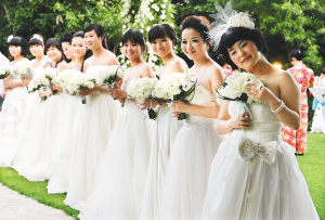 9月20日,喜悦的新娘们在三亚天域度假酒店参加集体婚礼庆典。今年中秋节、国庆节期间,三亚各景区、酒店均推出各具特色的婚庆产品,很受年轻情侣的欢迎。 本报记者 苏建强 摄