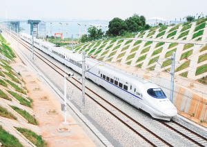 9月20日,一列“和谐号”高速动车行驶在昌九城际高铁九江段。我国中部地区首条城际高铁———昌九城际高铁正式开通运行。昌九城际高铁全长135公里。开通运行后,江西南昌至九江最快45分钟即可到达,两城将形成“一小时城际圈”。 新华社发(胡国林 摄)