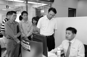| 在全省各市县银行网点配备网上办税自助终端机,供纳税人免费使用。图为省国税局林明鹊局长(右二)在银行网点视察办税自助终端机使用情况。 曲易伸 摄影 |