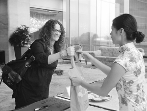 | 工作人员向参加推介会的外交官赠送三亚相关资料。 本报特派记者 张谯星 摄 |