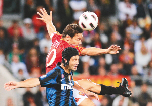 9月26日,在意甲联赛第五轮比赛中,国际米兰队客场以0:1不敌罗马队。图为国米球员齐沃(下)与罗马球员托蒂争顶。 新华社发