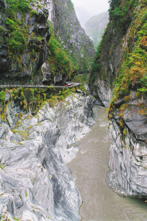 令人惊叹的是,沿着太鲁阁大峡谷陡峭的悬崖峭壁,竟然还有一条较高等级的公路,宽不足10米,大巴车可以自由通行,但会车时要考验司机驾驶技术了,一些狭窄路段两车相遇,其中一辆要倒车数十米甚至百米以上,找到宽敞路面才能错车通过。在这样的峡谷修路,难度可想而知。随车台湾导游介绍说,上世纪五六十年代,国民党撤台军队近10万人开进太鲁阁大峡谷,在悬崖绝壁上凿石槽、打隧道、架桥筑路,许多老兵葬身峡谷或因此致残。3年苦战,被称为全岛笫一景观公路的中横公路终于建成,横贯台湾岛南北,穿越太鲁阁大峡谷。