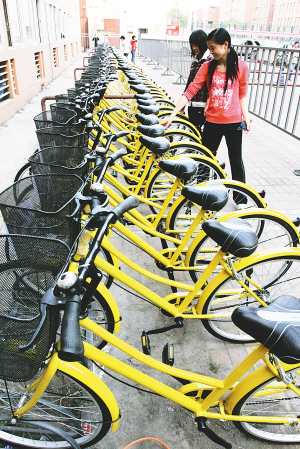 9月26日,两名大学生在观看校园内的“同心车”。 当日,天津高校首批200辆“同心车”亮相天津医科大学,学生可免费使用,实现“绿色”出行。新华社发(李想 摄)