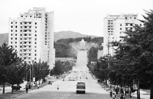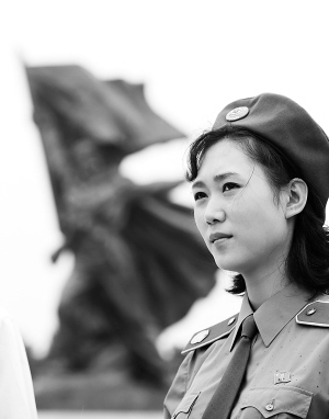 在平壤祖国解放战争胜利纪念塔前的女讲解员。