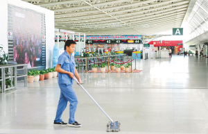 ↑9月29日,环卫工人在凤凰国际机场候机厅打扫地板,以整洁面貌迎接国庆黄金周。