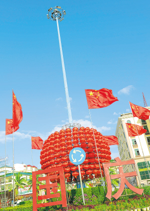 ←9月29日,三亚下洋田路口300个大红灯笼组成一个巨型灯笼。 (本栏图片均由本报记者苏建强 摄)
