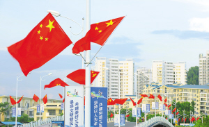 ↑9月29日,三亚丰兴隆大桥上迎风飘扬的五星红旗。