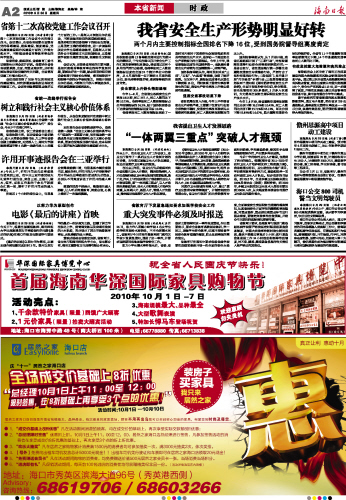 海南日报 本省新闻时政 002 2010-09-301 2010年09月30日 星期四