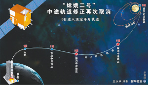 据朱民才介绍,在10月2日实施的首次中途轨道修正中,北京中心对姿控扰动建立了精确的补偿模型,通过认真计算、反复复核,对卫星成功实施了首次轨道中途修正。从对修正后的轨道测量计算结果分析来看,控制非常精准,满足卫星到达近月制动点的精度要求,所以,原计划于此后进行的2次中途修正不再进行。这标志着我国航天轨道测定及控制技术达到精确水平。接连取消中途轨道修正,将为嫦娥二号卫星节约部分燃料,为卫星在环月轨道开展绕月探测工作提供更多动力支持。