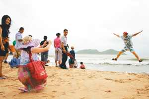 10月4日, 一游客在海南陵水分界洲海边兴奋地跳起来。 陵水分界洲国庆期间吸引了岛内外众多游客前来游玩。 本报记者古月 通讯员尹辉摄